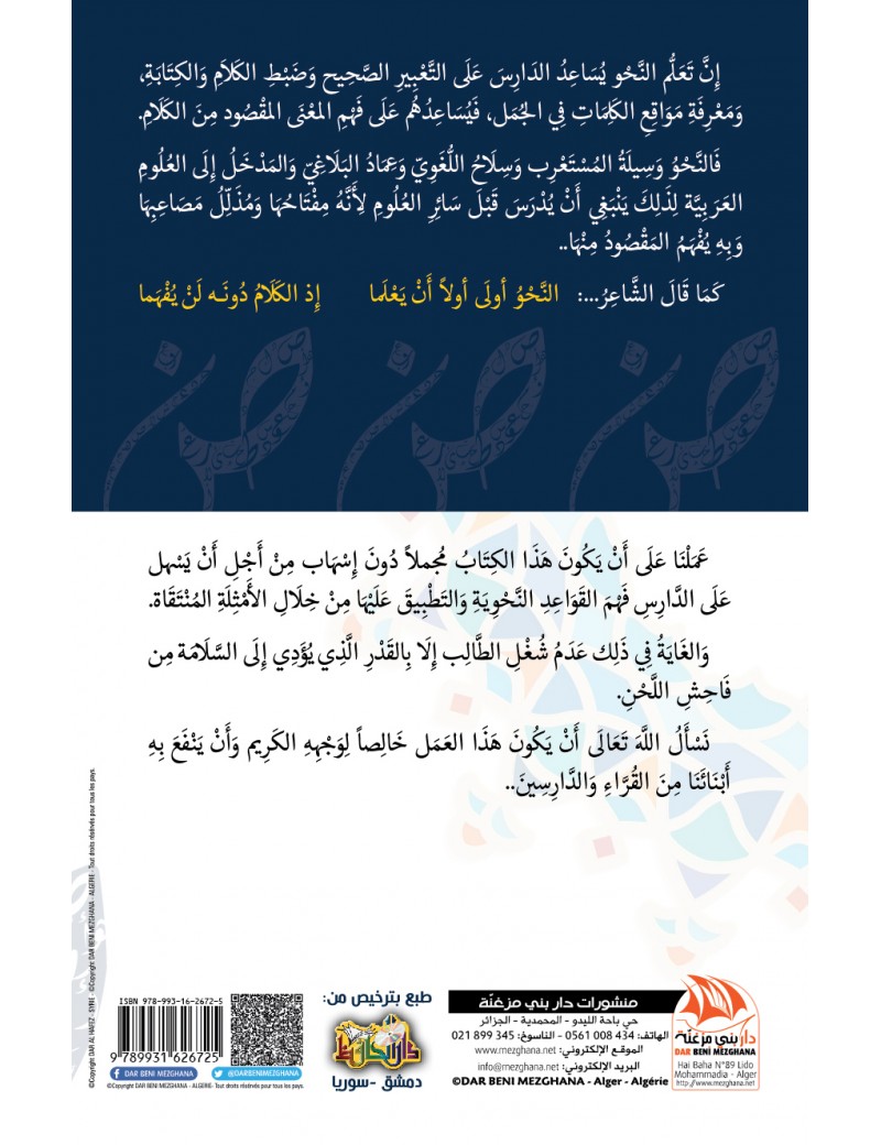 فَالنَّحْوُ وَسِيلَةُ المُسْتَعْرِب وَسِلَاحُ اللُّغَوِيّ وَعِمَادُ البَلَاغِيّ وَالمَدْخَلُ إِلَى العُلُومِ العَرَبِيَّة لِذَلِكَ يَنْبَغِي أَنْ يُدْرَسَ قَبْلَ سَائِرِ العُلُومِ لِأَنَّهُ مِفْتَاحُهَا وَمُذَلِّلُ مَصَاعِبِهَا وَبِهِ يُفْهَمُ المَقْصُودُ مِنْهَا..